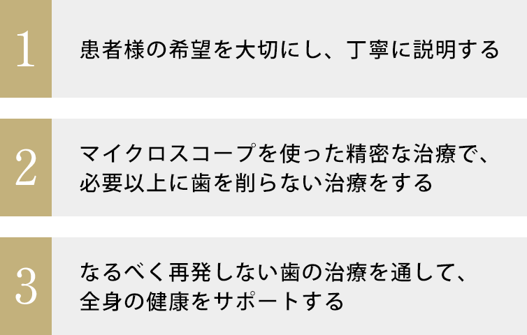 お一人お一人のお悩みや希望をうかがい、丁寧に治療方針を説明することを大切にしております。気になることがあれば親切丁寧にお答えしますので、お気軽にご質問ください。当院では、ほぼすべての治療にマイクロスコープを使用しております。マイクロスコープは肉眼の約20倍の拡大率で治療ができるため、より精密な治療に繋げることができます。